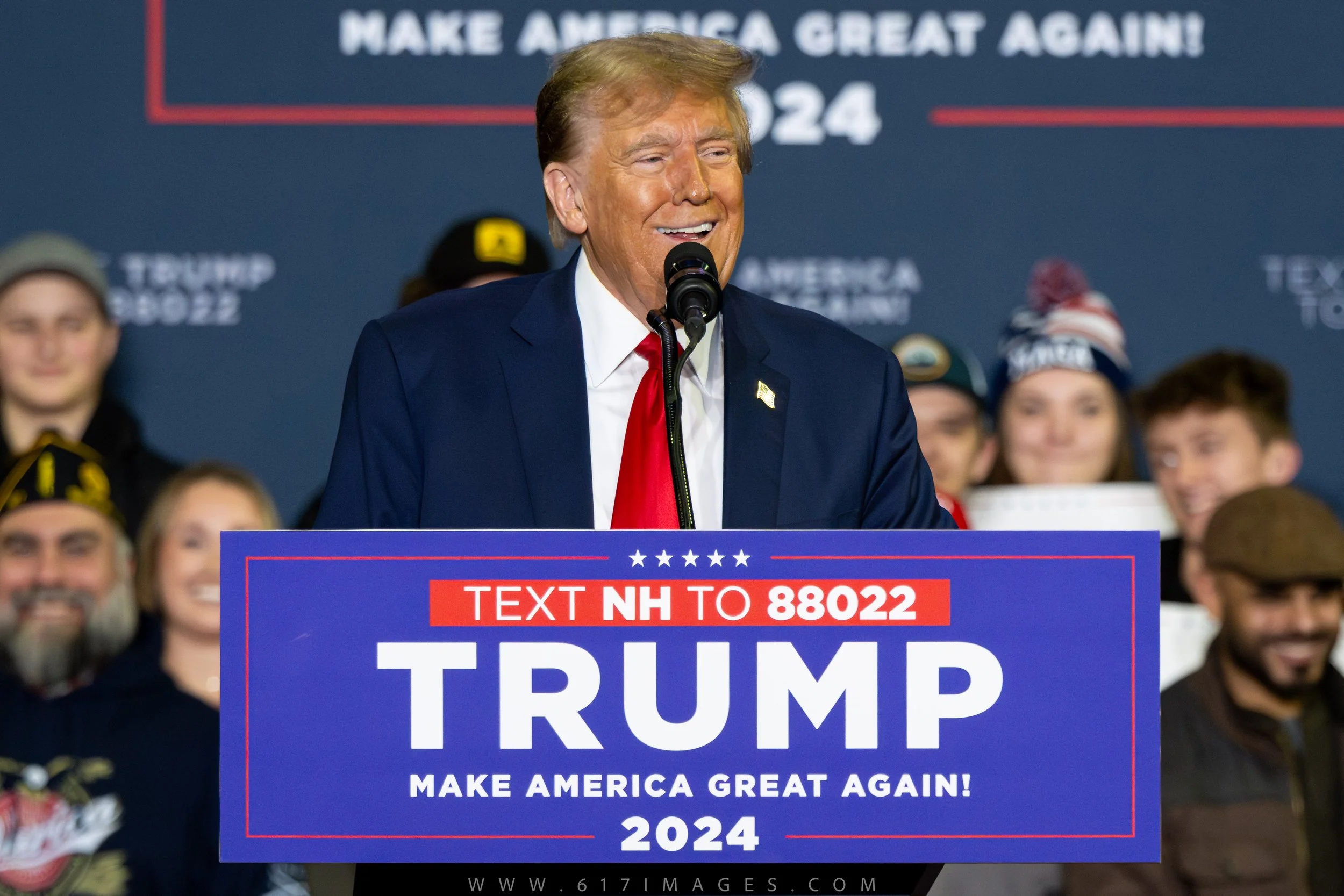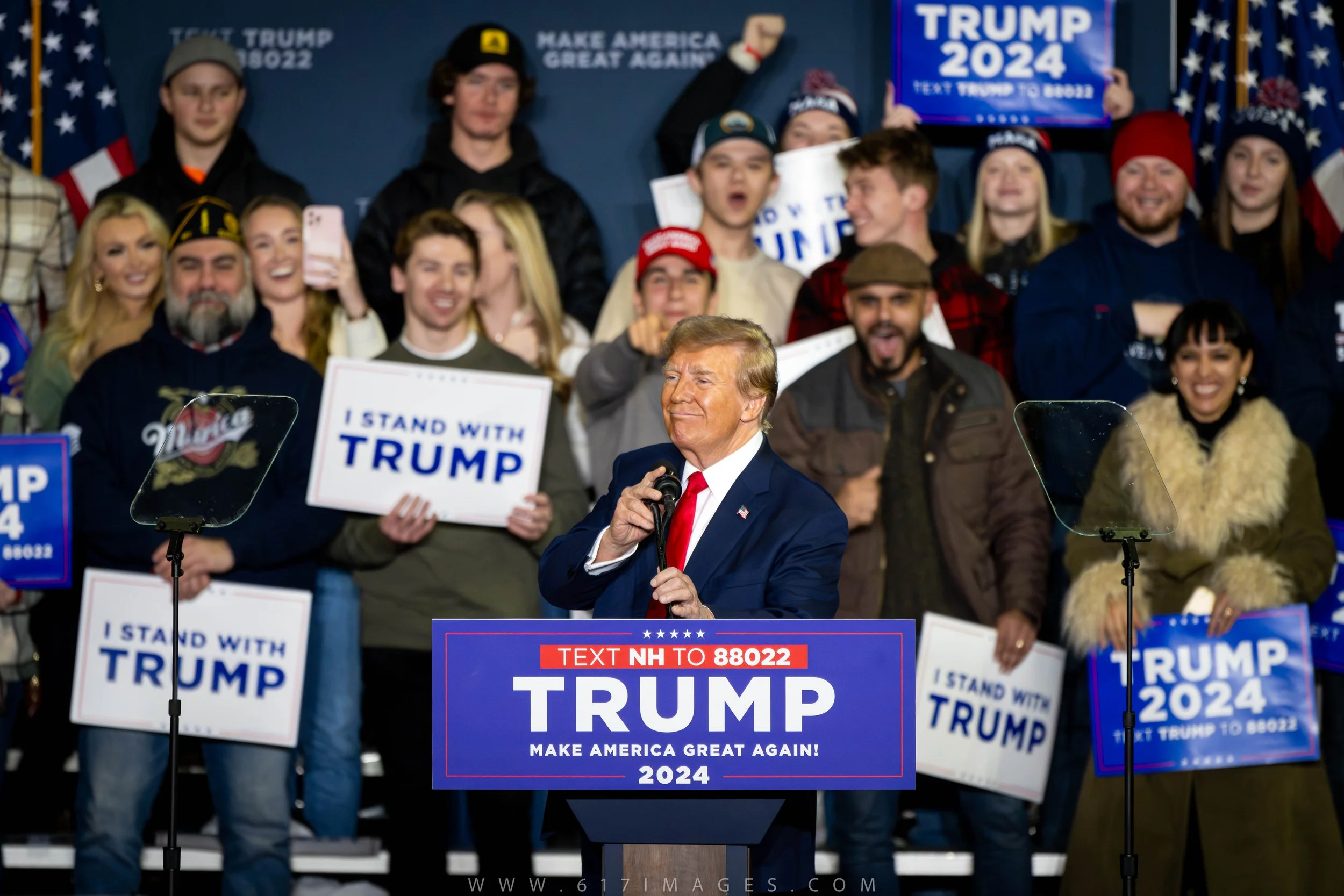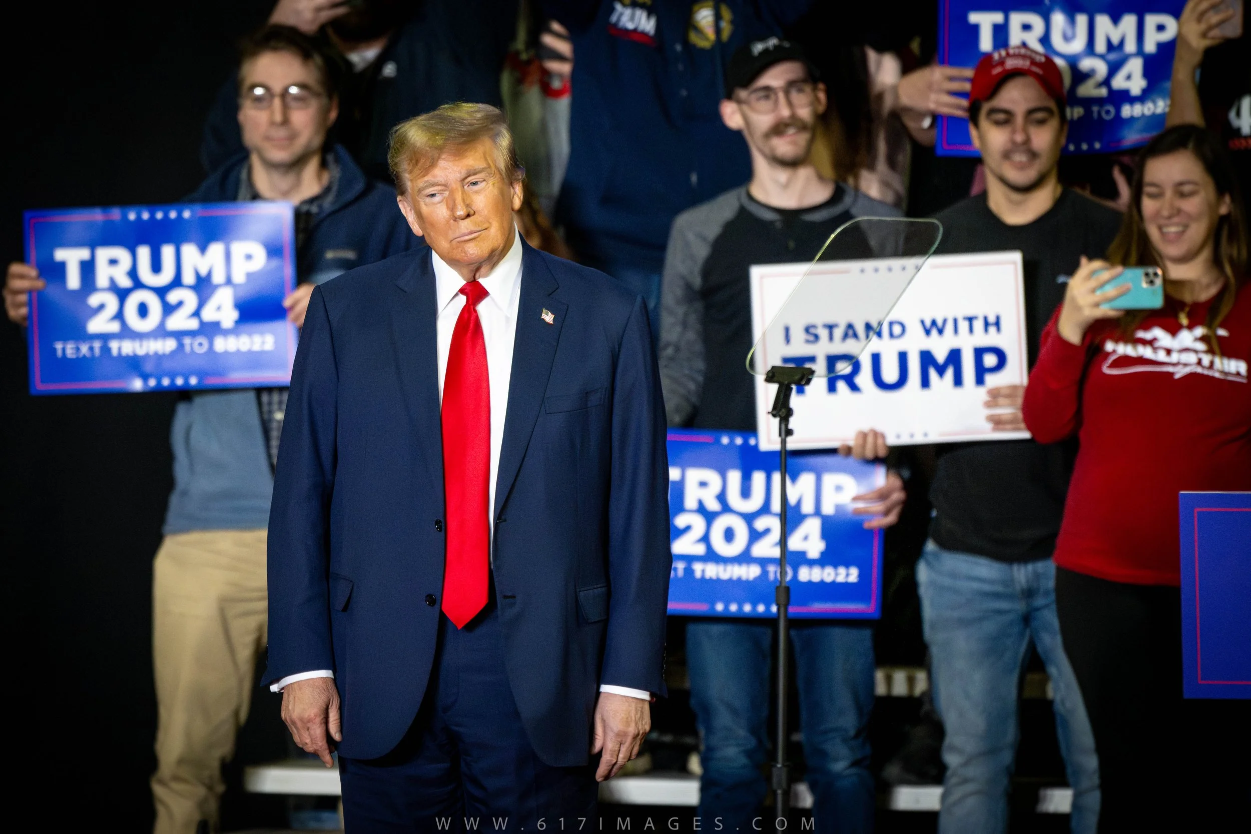 President Trump stands in front of his supporters during his NH rally.