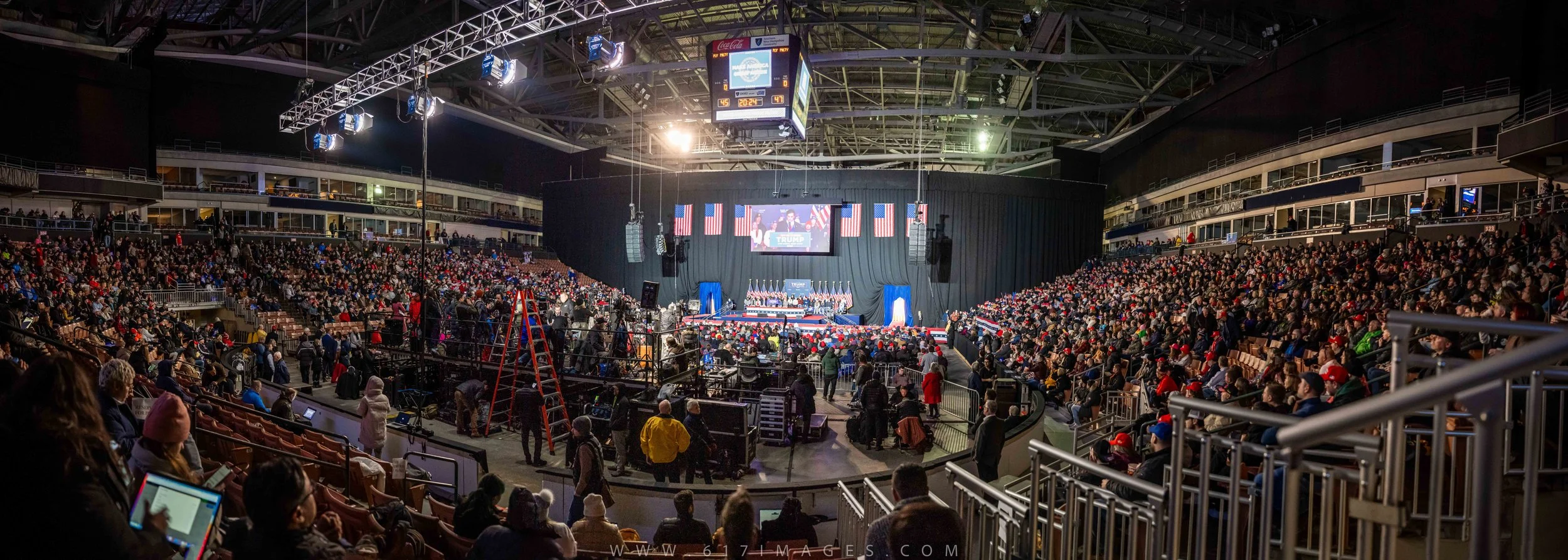Panoramic view of the inside of the SNHU Arena and the crowd in Manchester NH ahead of Trump speaking.