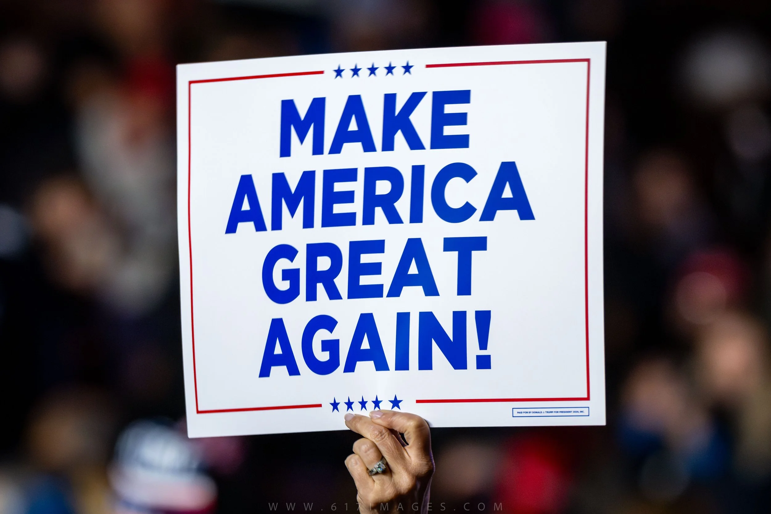 A Trump supporter holds up a Make America Great Again campaign sign.